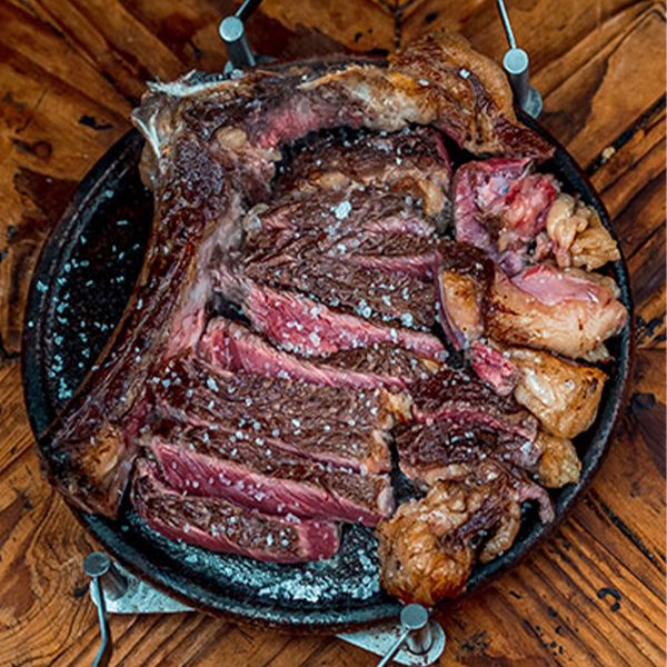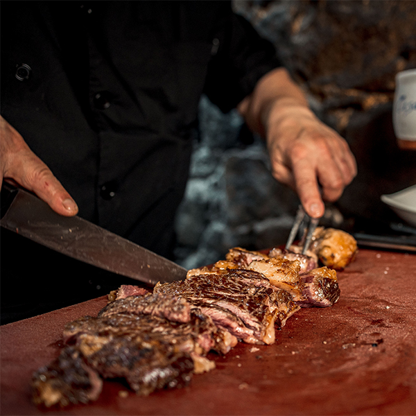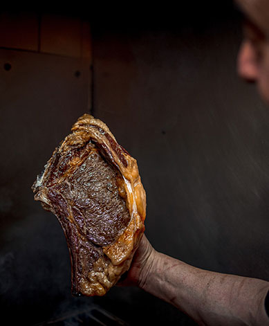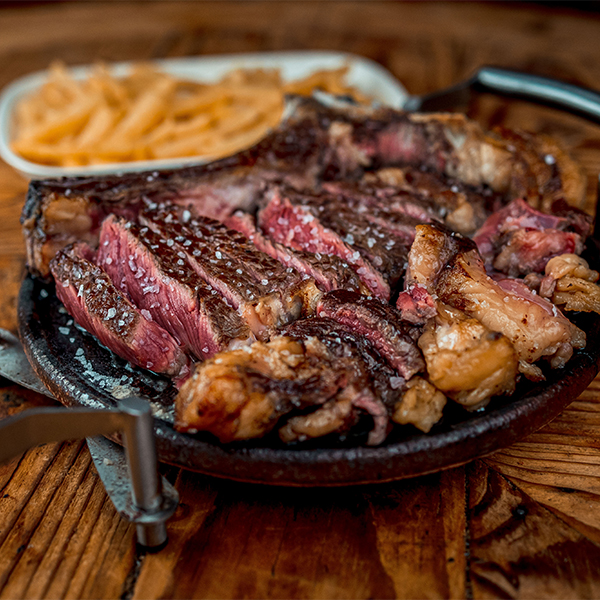 Nuestra especialidad, sin duda, nuestro famoso txuletón. A la brasa, como debe ser, con ganado gallego o de la Tierra, servido con patatas fritas…